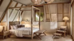 Materiality is rooted in context—local stone, carved wood, and jaali screens balance refinement with authenticity. High overhangs, shaded courts, and natural ventilation reflect climate-responsive design, while lighting emphasizes landscape and artful detail without overwhelming the wilderness night.