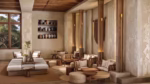 Complementing these, a spa and recreation pavilion nestles discreetly in the landscape, offering wellness and leisure within semi-open courts, water features, and shaded play areas. Circulation is choreographed as a journey of discovery: arrivals build anticipation through winding drives, while pathways lead guests deeper into tranquil zones, shifting from the sociable heart to private retreats.