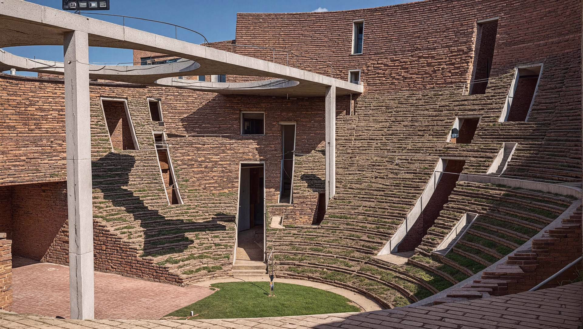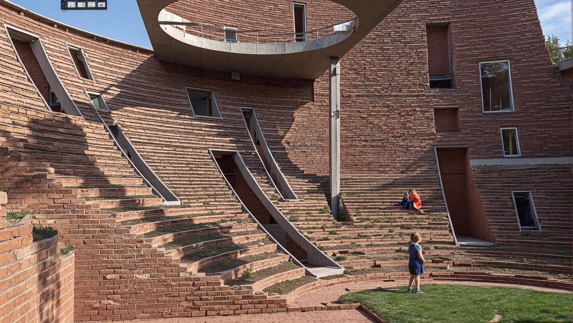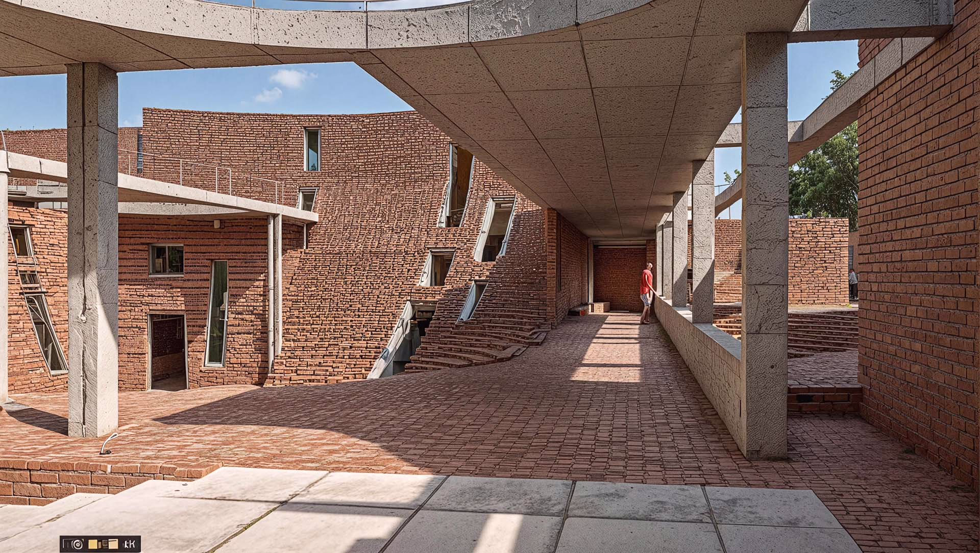 Built almost entirely from hand-pressed bricks sourced in Punjab, the structure nestles half-level below grade. Earth berms insulate the envelope, while circular roof apertures and vegetated terraces usher daylight and fresh air deep inside—passive strategies that keep interiors cool through the region’s long, hot summers and dramatically reduce operational energy. The resulting topography of curved walls and green roofs feels less like a building and more like an exploratory landscape scaled to young imaginations.