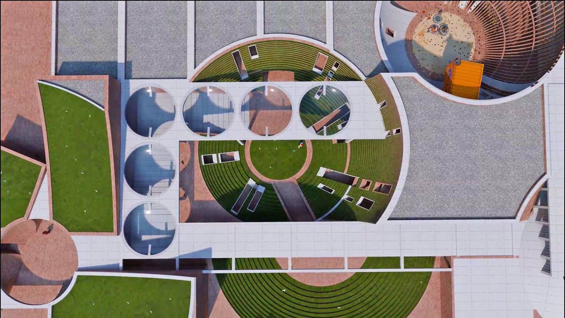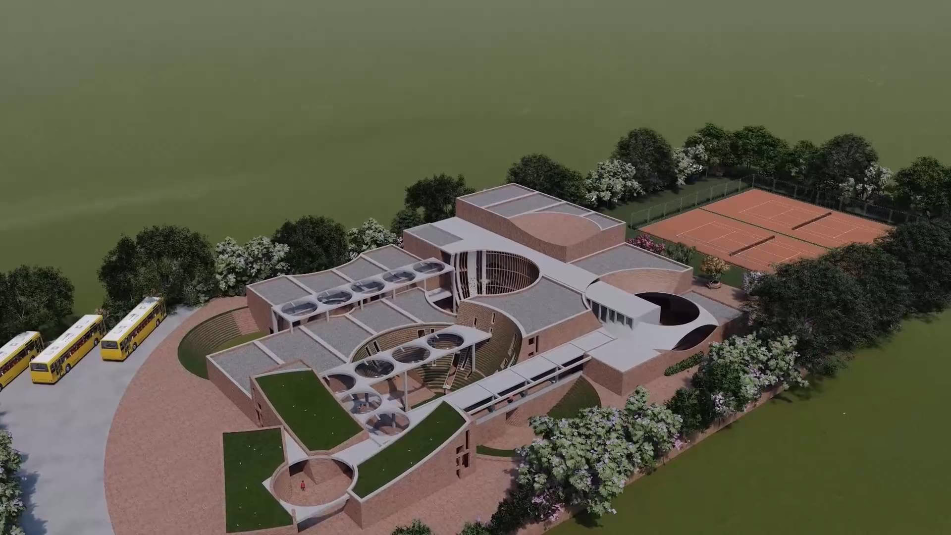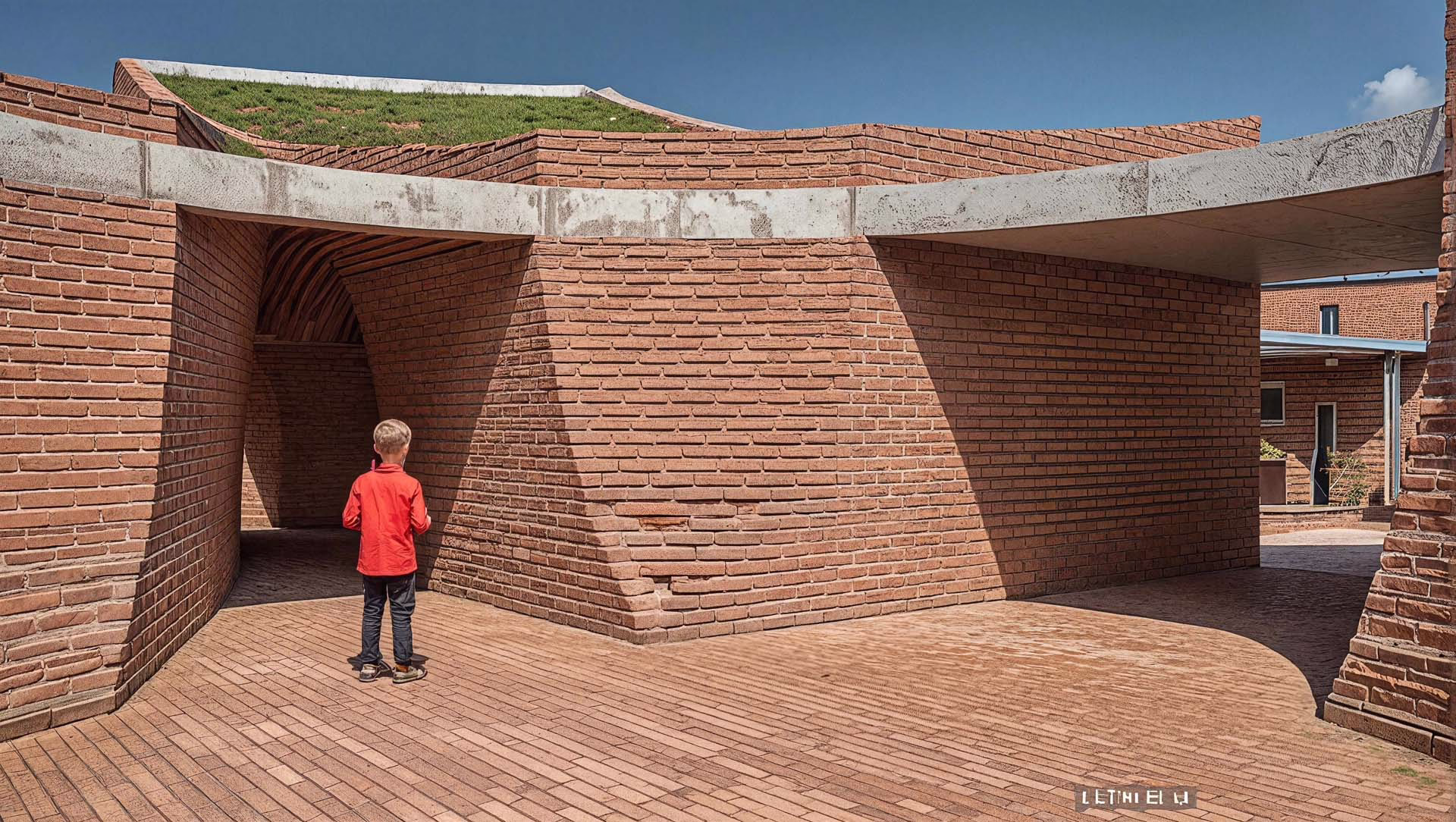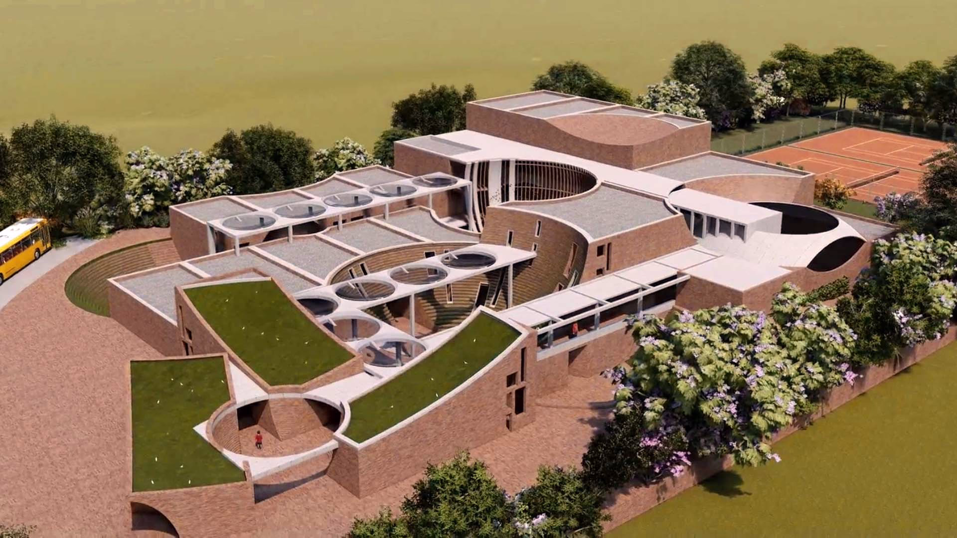 Built almost entirely from hand-pressed bricks sourced in Punjab, the structure nestles half-level below grade. Earth berms insulate the envelope, while circular roof apertures and vegetated terraces usher daylight and fresh air deep inside—passive strategies that keep interiors cool through the region’s long, hot summers and dramatically reduce operational energy. The resulting topography of curved walls and green roofs feels less like a building and more like an exploratory landscape scaled to young imaginations.