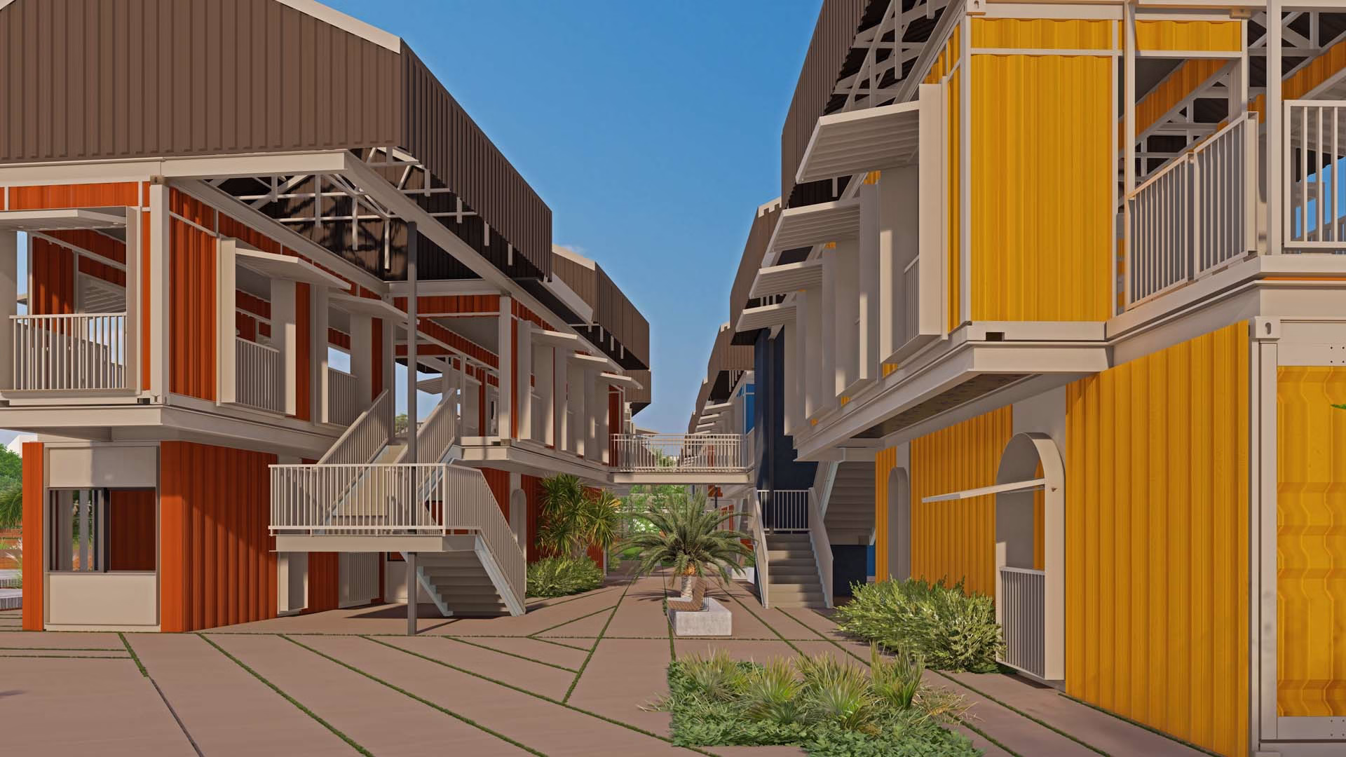 Spatially, the clusters weave along a meandering pedestrian spine that echoes the organic geometry of traditional Goan streets. Pocket courts, shaded bridges, rooftop terraces and occasional viewing decks break any sense of repetition, while native palms, bauhinias and flowering shrubs seed an evolving biodiversity corridor radiating from the central pond. The kit-of-parts logic allows each container typology—retail stall, café kitchen, kiosk corridor or restroom—to be re-skinned or re-arranged as demand shifts, ensuring long-term adaptability without demolition. Together these strategies create an open-air marketplace that is light on resources yet rich in experience: a prefabricated village where sustainability, cultural memory and artisan commerce coalesce into a contemporary “walk in the park” for locals and travellers alike.
