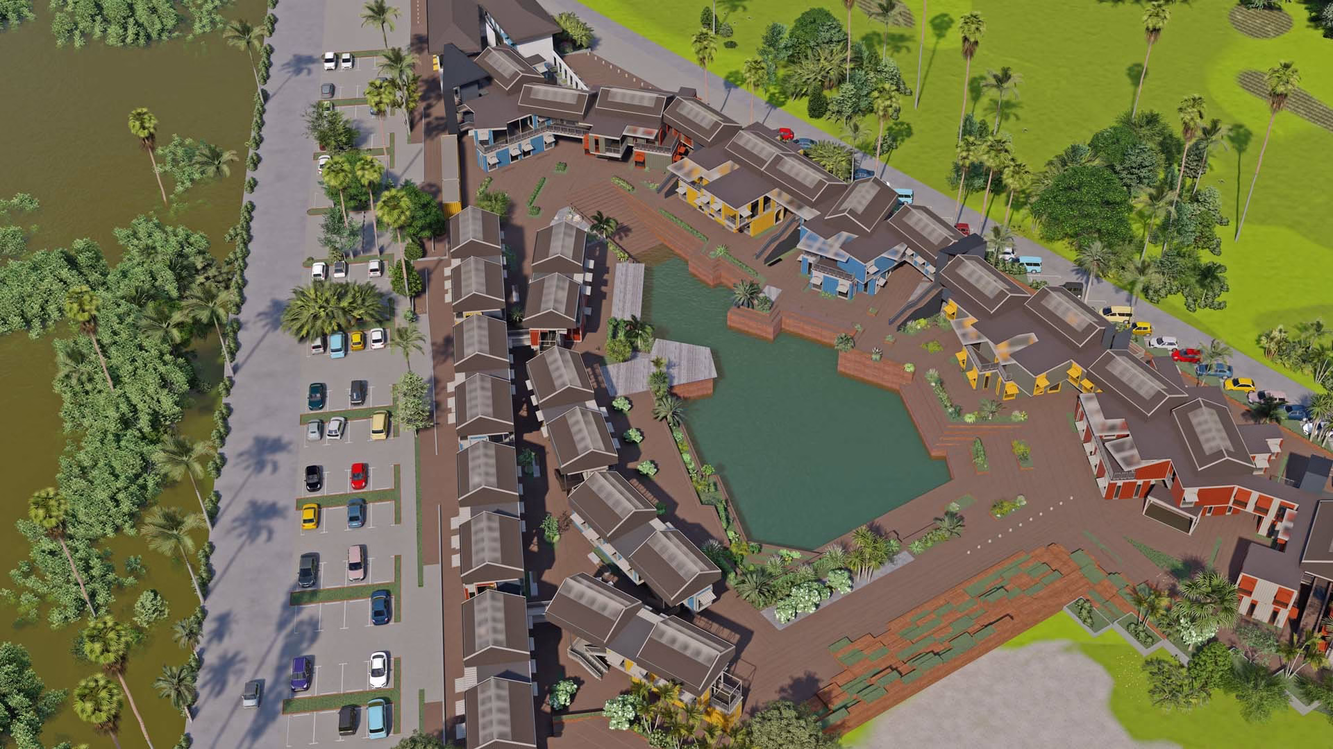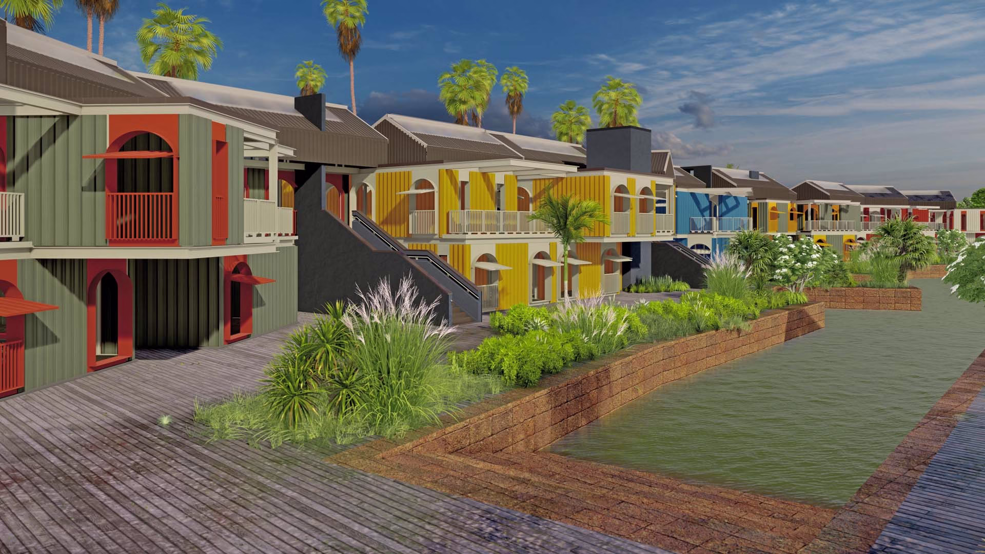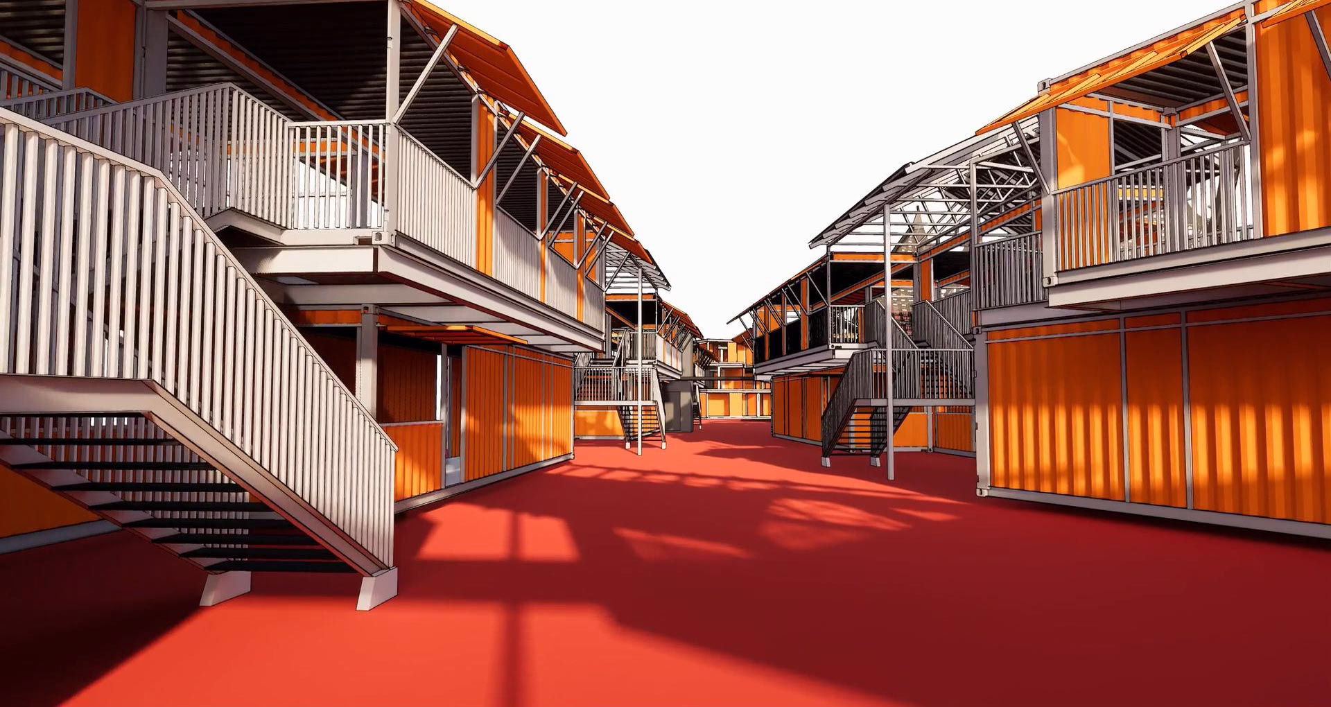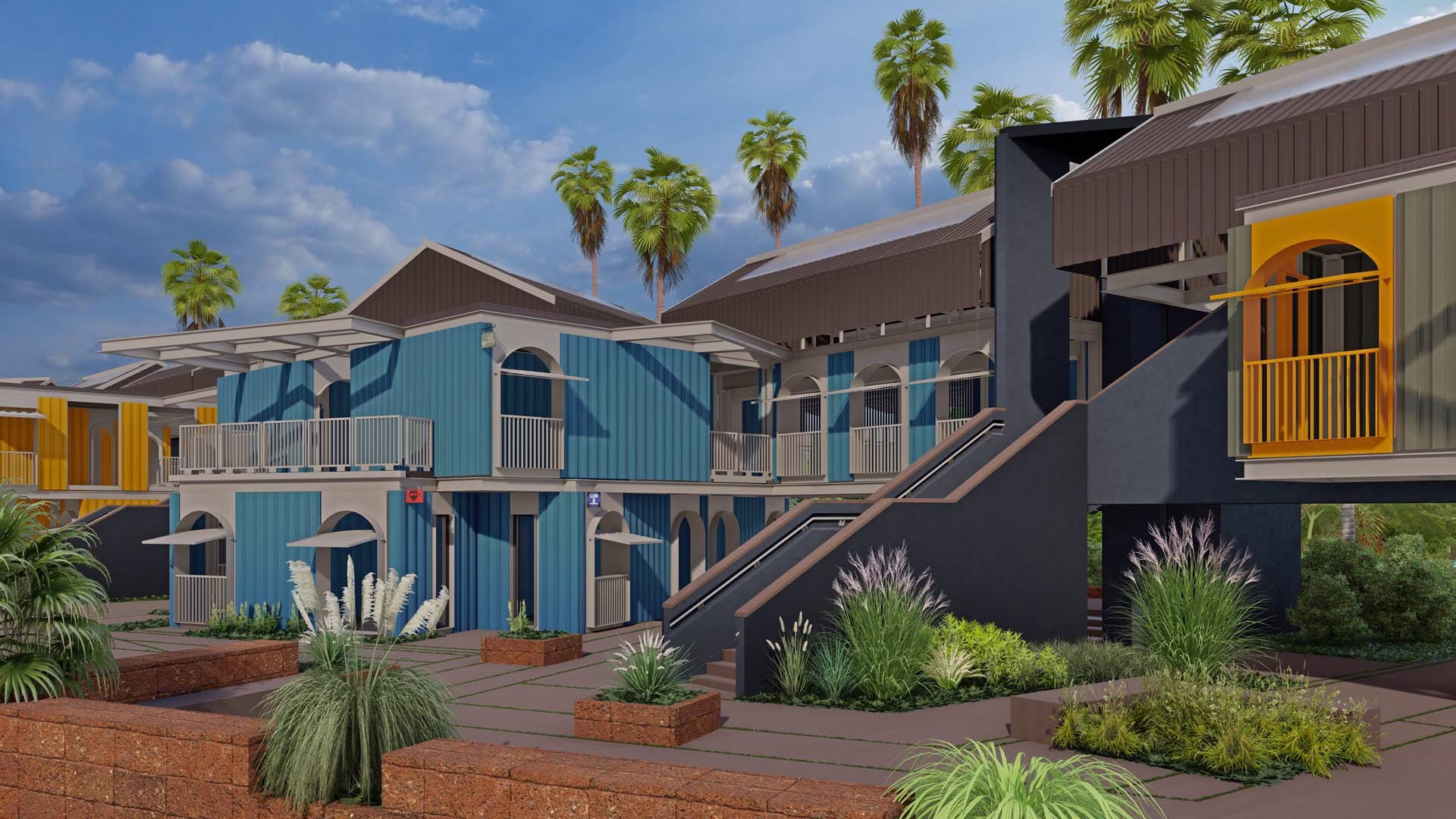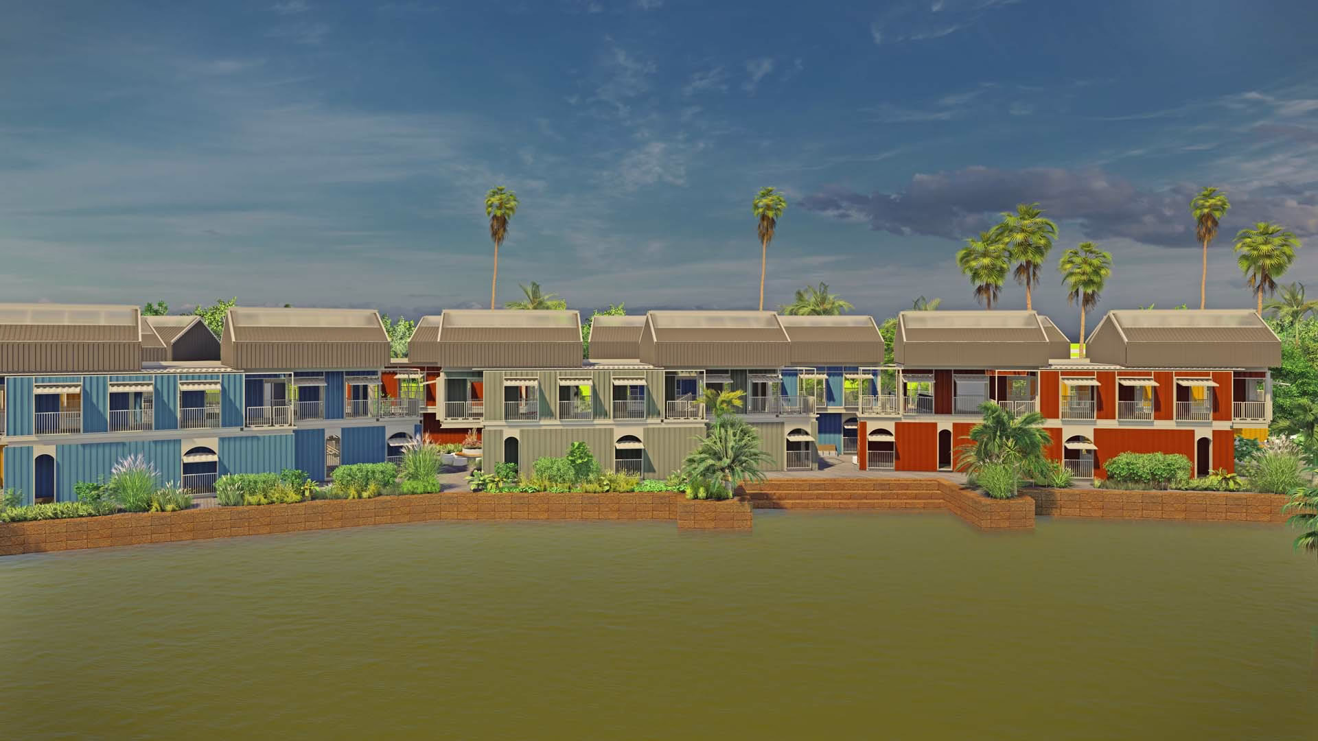 Every container is fabricated off-site in a nearby factory, complete with modular windows, railings, climate-responsive shutters that unfold into deep monsoon canopies, and plug-and-play services. Once numbered and finished, the boxes are craned onto light foundations and stitched together with pre-engineered steel members, trimming on-site work by more than 80 percent and dramatically cutting carbon emissions and construction waste. The only in-situ element is the ground-level landscape: an elongated rain-harvesting pond encircled by a timber boardwalk punctuated with stepped ghats, inviting slow strolls and lakeside conversations emblematic of Goa’s laid-back culture.