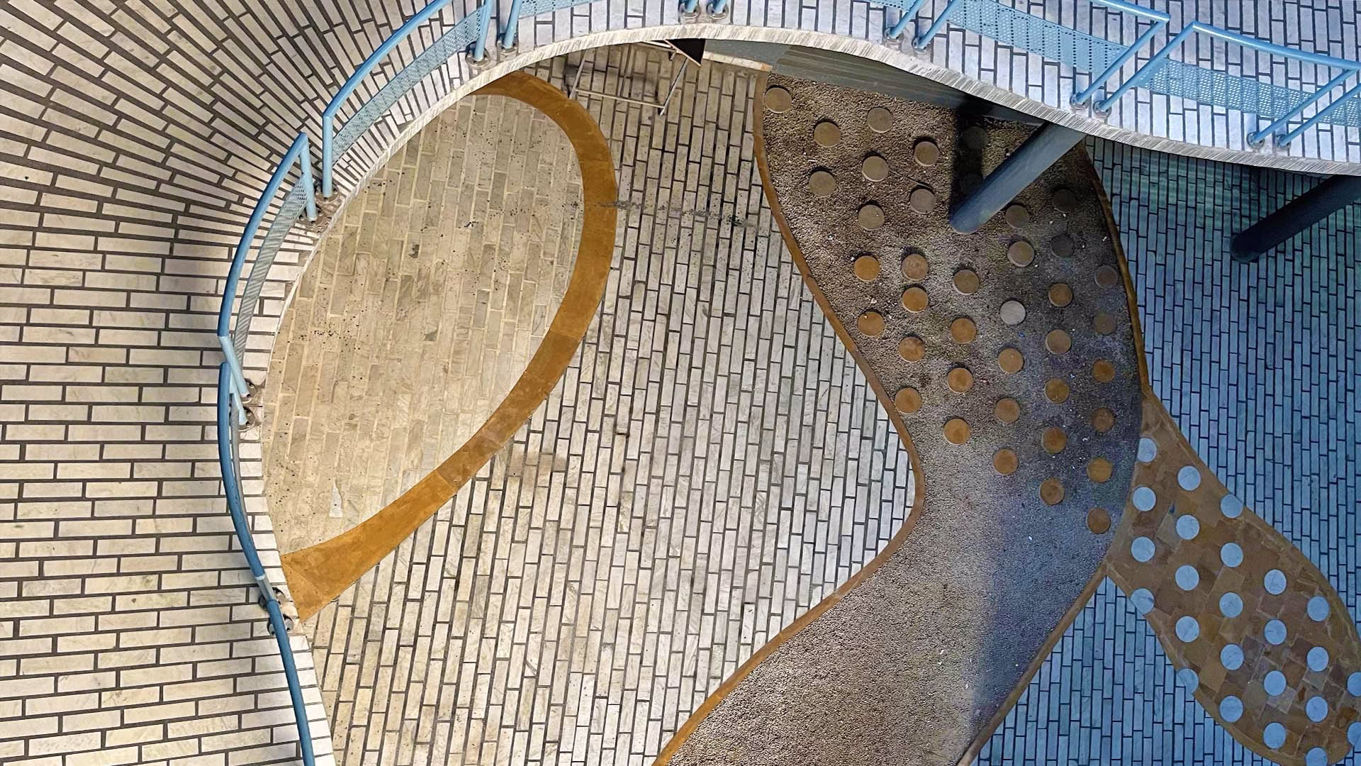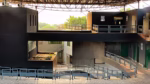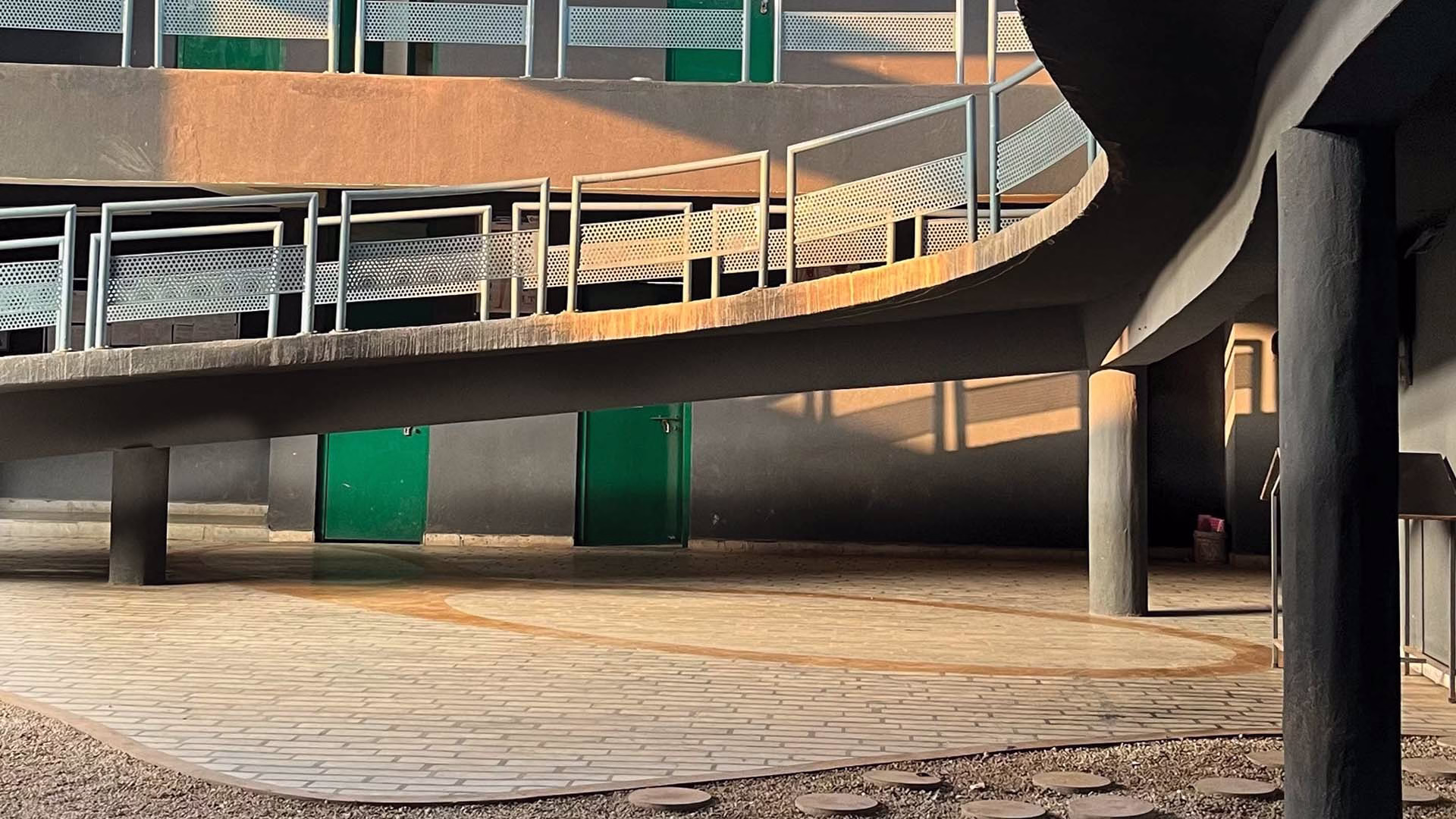 The plan is organised around two adjoining courts. At ground level, a sculpted water body and sinuous ramp choreograph a fluid promenade that links seminar halls, classrooms and the library in a single, accessible loop. On the first floor the courts reappear, mirroring one another to create a continuous stack that works like a thermal chimney: hot air rises through the voids and slips out beneath the parasol, drawing cooled breeze across teaching spaces and reducing dependence on mechanical air-conditioning.