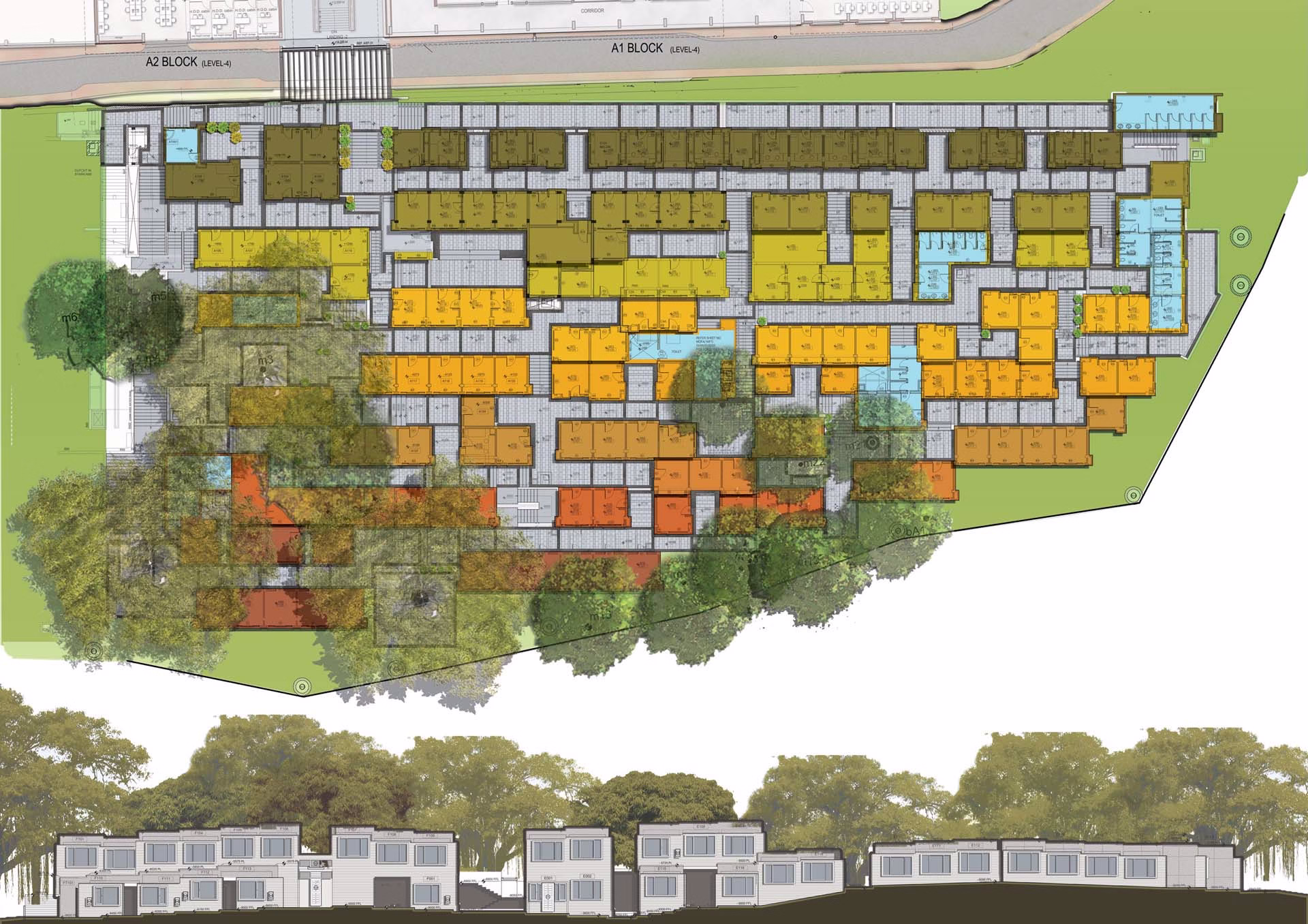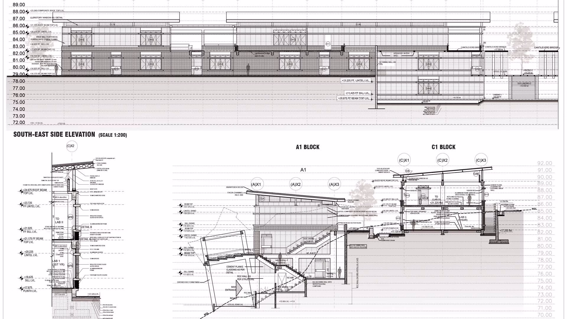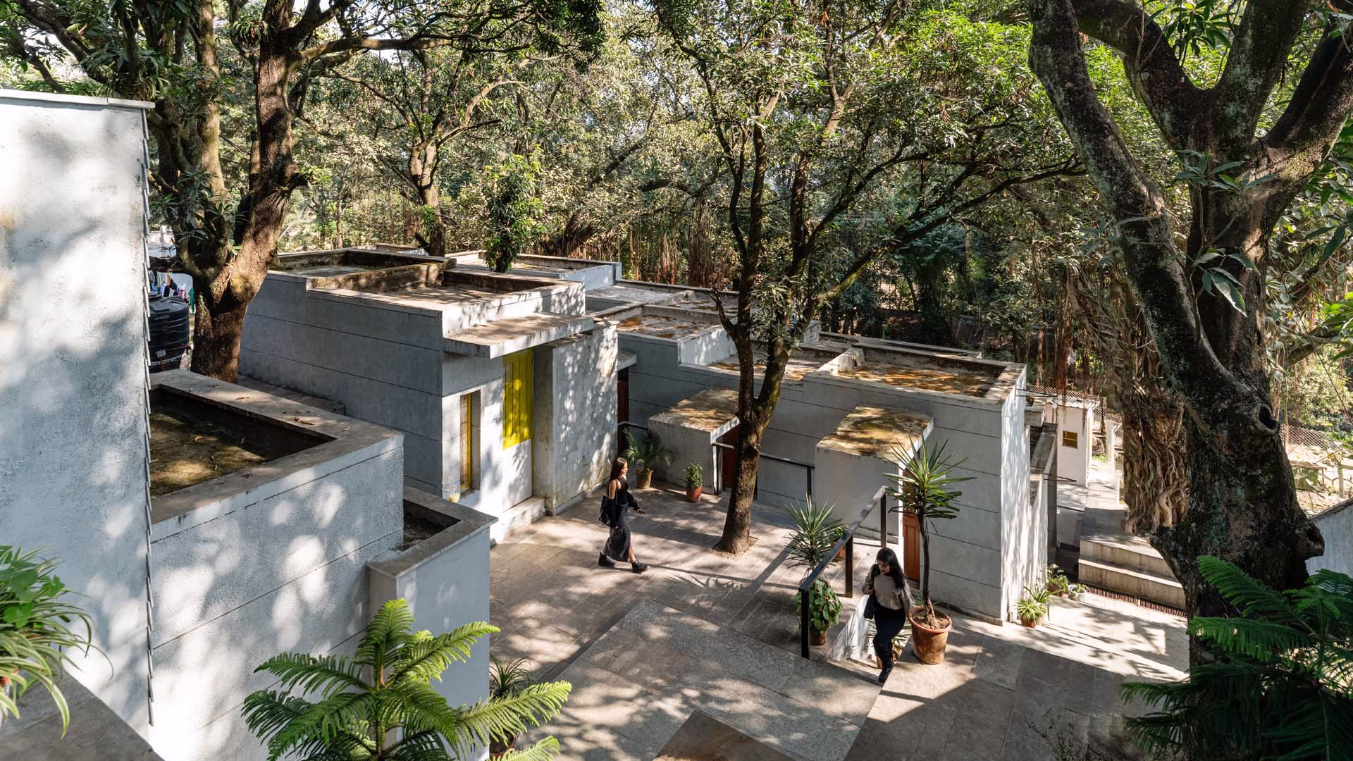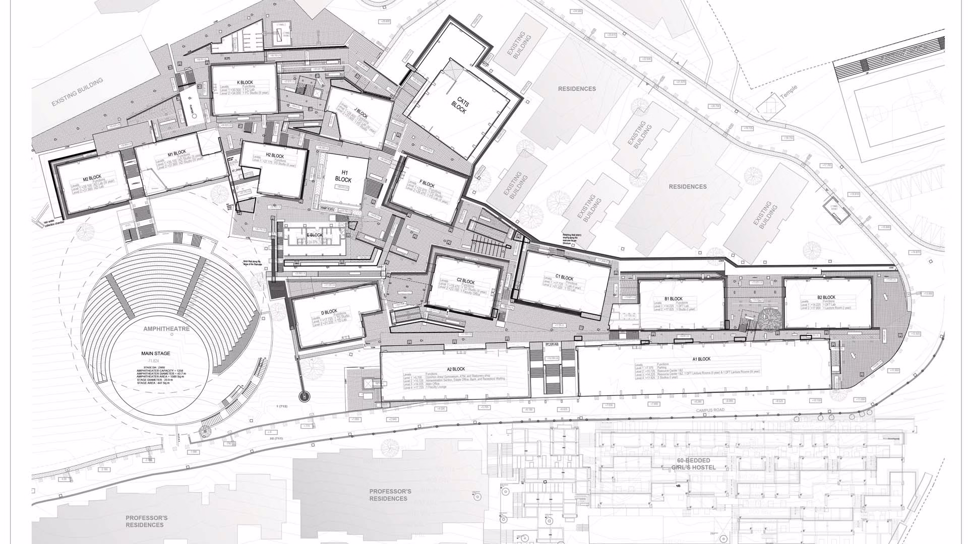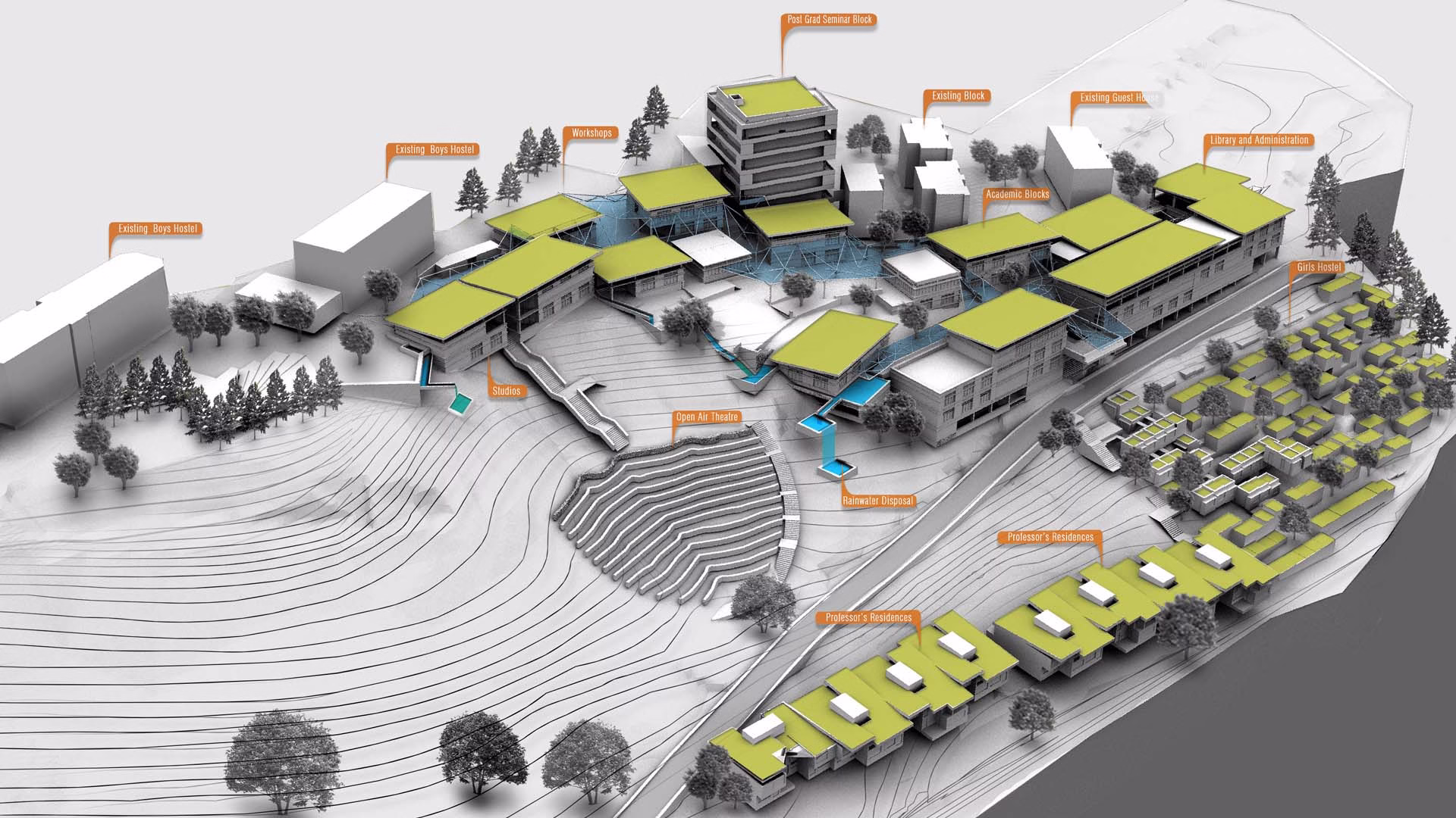 Academic blocks, workshops, hostels and faculty residences manifest as interlocking cuboids that step with the slope like a village growing organically around banyan, mango and silver-oak trees. No tree was cut or relocated; instead, hostel rooms within the Residential village “pixelate” the hillside, leaving open voids that allow branches to puncture balconies and mangoes to drop into shared courtyards—turning everyday life into an ever-changing design studio for students.
