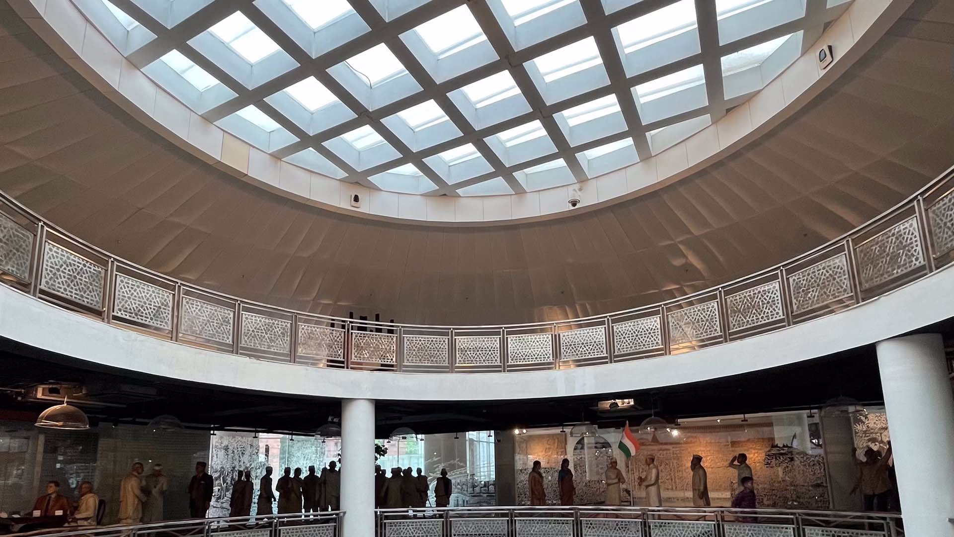Crowning the Rashtrapati Bhavan Museum is a 45-metre-diameter flat dome—an abstracted echo of Sir Edward Lutyens’ original Durbar Dome—that announces the entrance rotunda and supplies diffused daylight deep into the building. Beneath this cap, the museum is organised as a vertical stack of galleries: visitors spiral down (or ascend back up) through chronological episodes of Indian statecraft while a full 65 percent of the 12,000 m² programme remains subterranean, safeguarding the palace skyline and adjacent heritage blocks.
